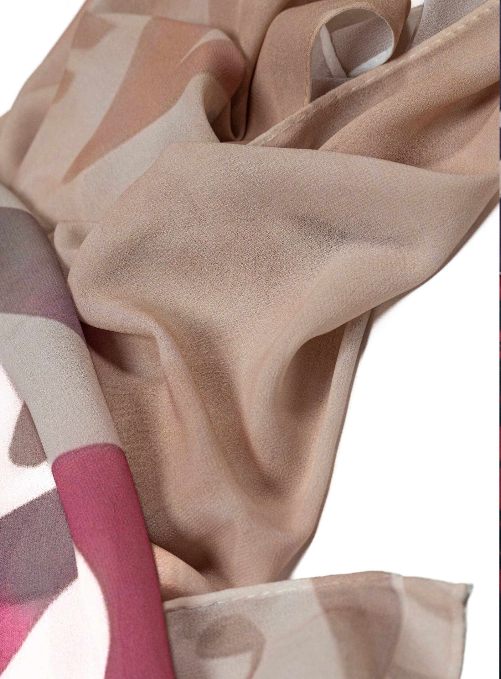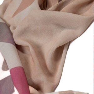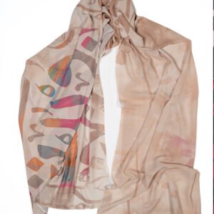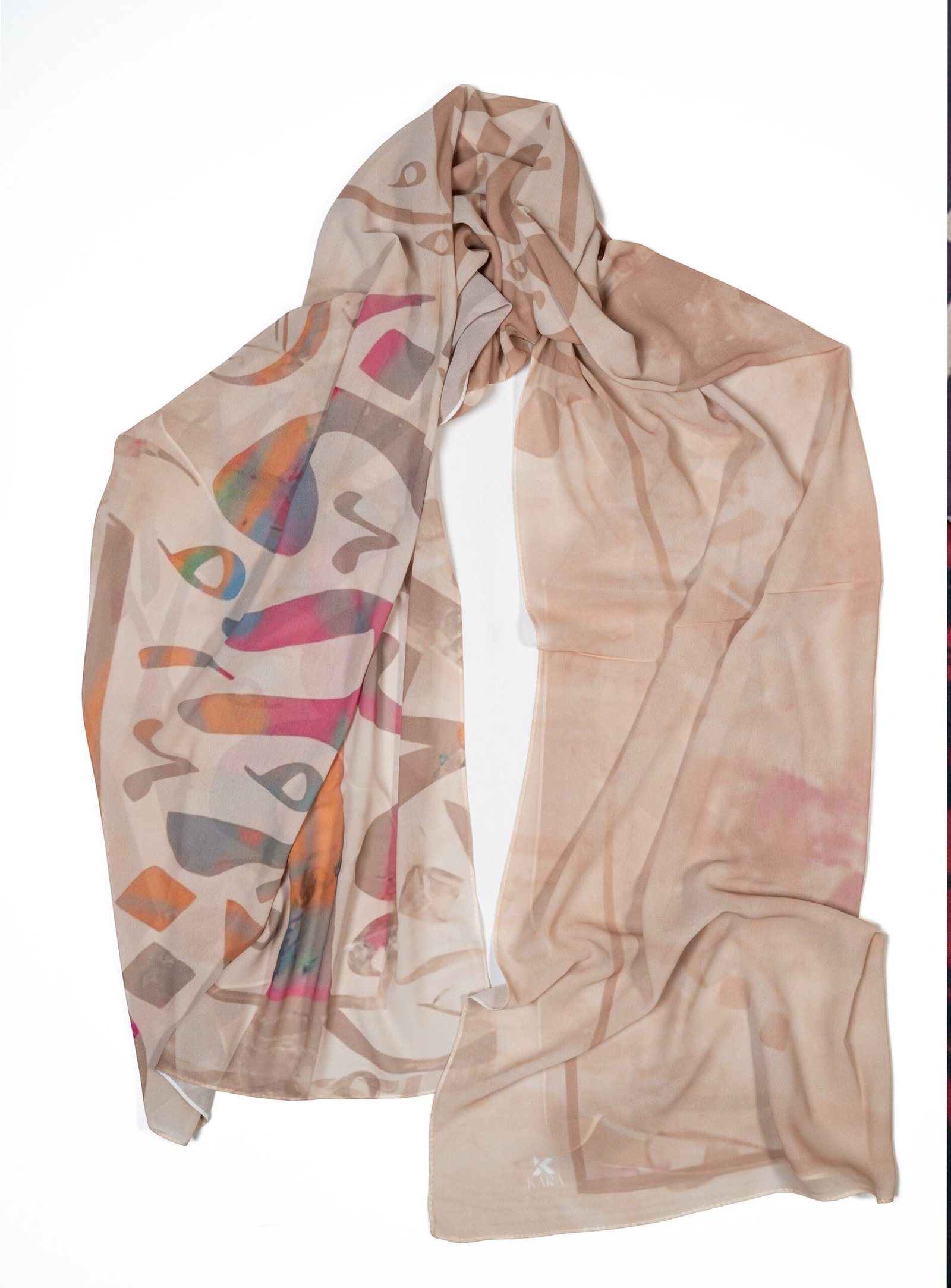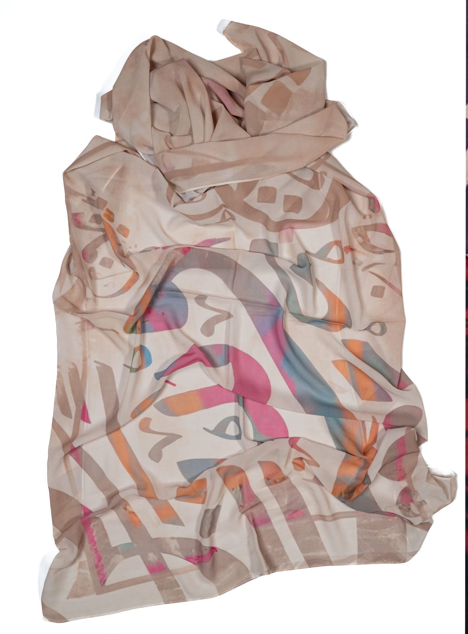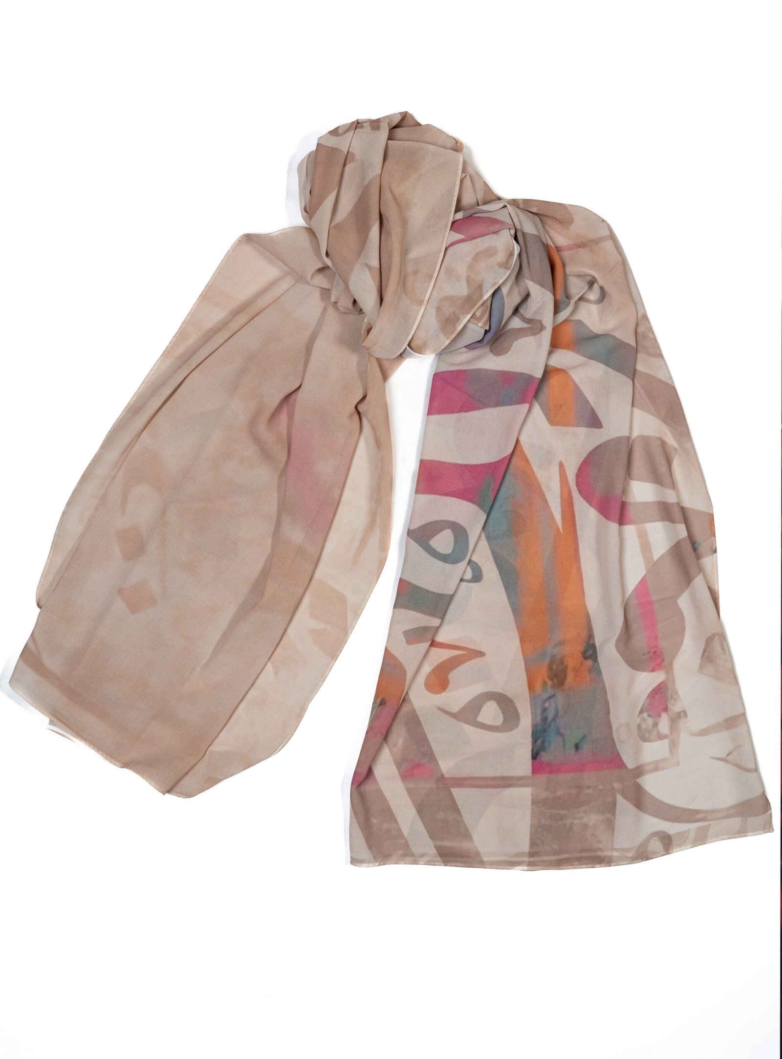 The Design: Modern Abstract & Earthy Tones The Asil hijab features a soft sand-beige background canvas, beautifully disrupted by contemporary abstract strokes. Reminiscent of deconstructed Arabic calligraphy, the print splashes vibrant hues of sunset orange, magenta pink, and teal blue across neutral earth tones. This unique color palette makes it incredibly versatile, pairing effortlessly with white, black, beige, or denim outfits.