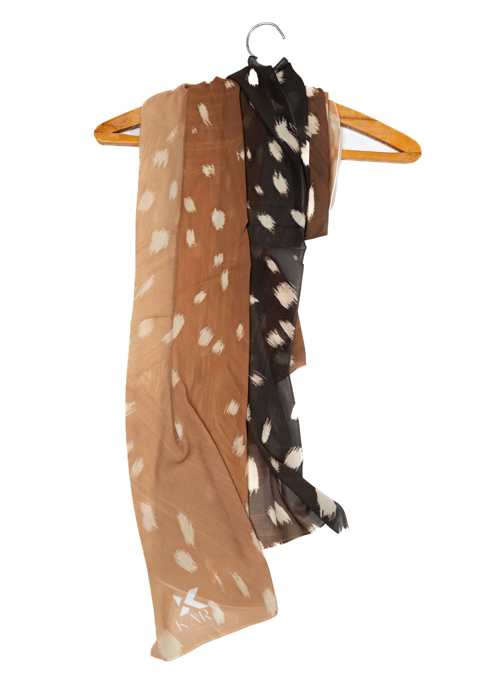 The Palette: One half features a warm camel/tan brown, while the other contrasts with a deep classic black. Both sides are scattered with soft, irregular white spots resembling a fawn’s coat.