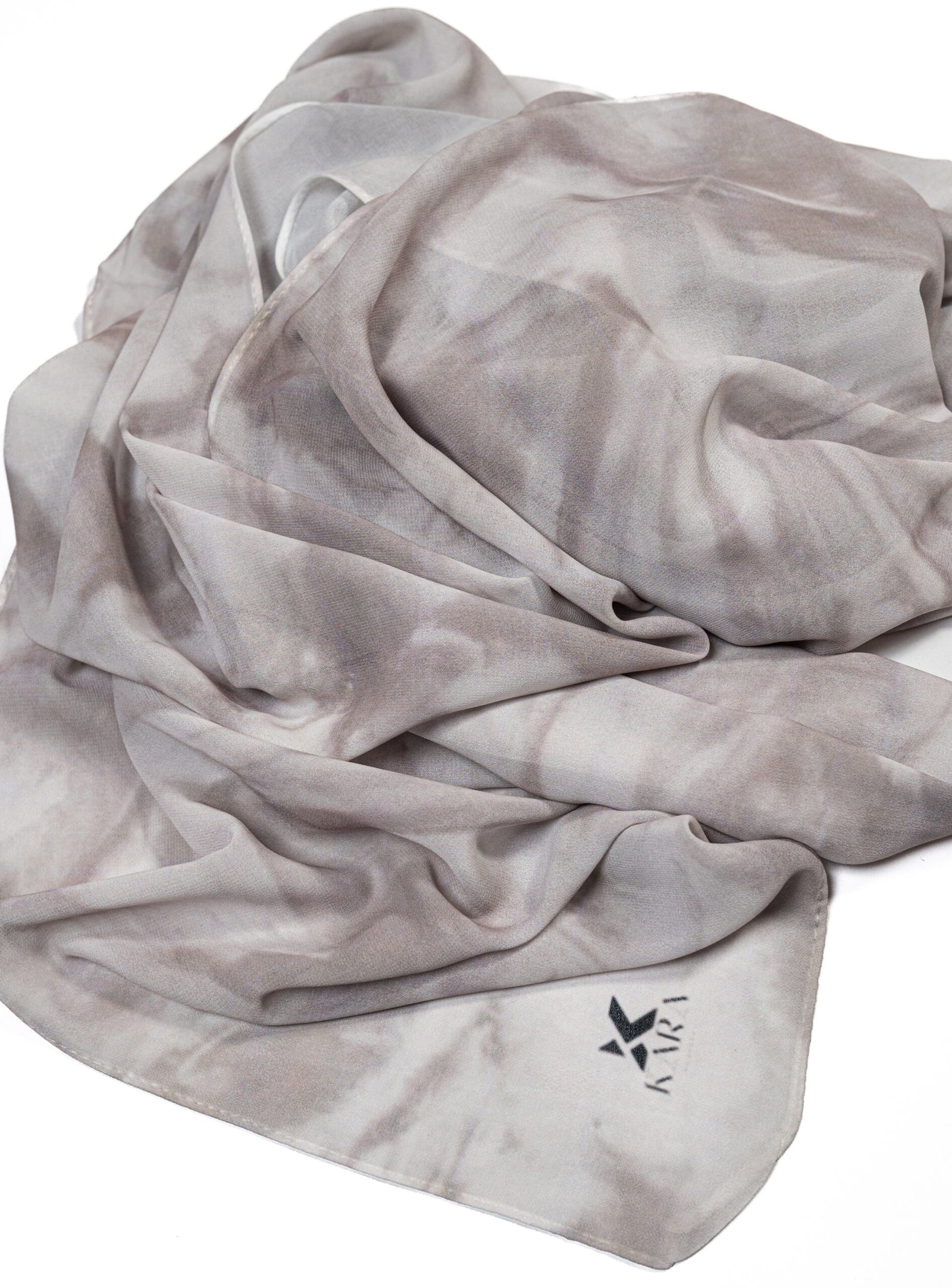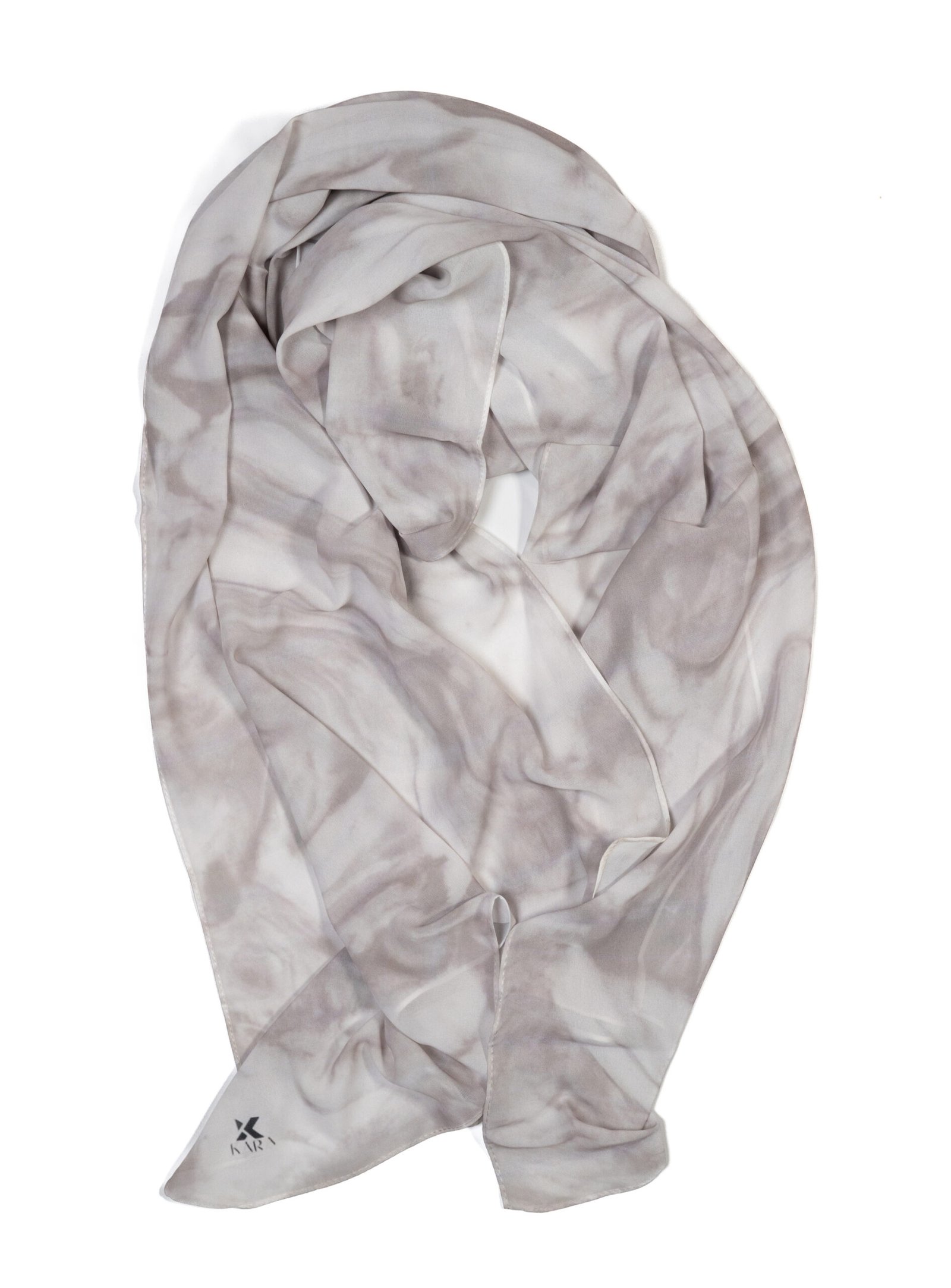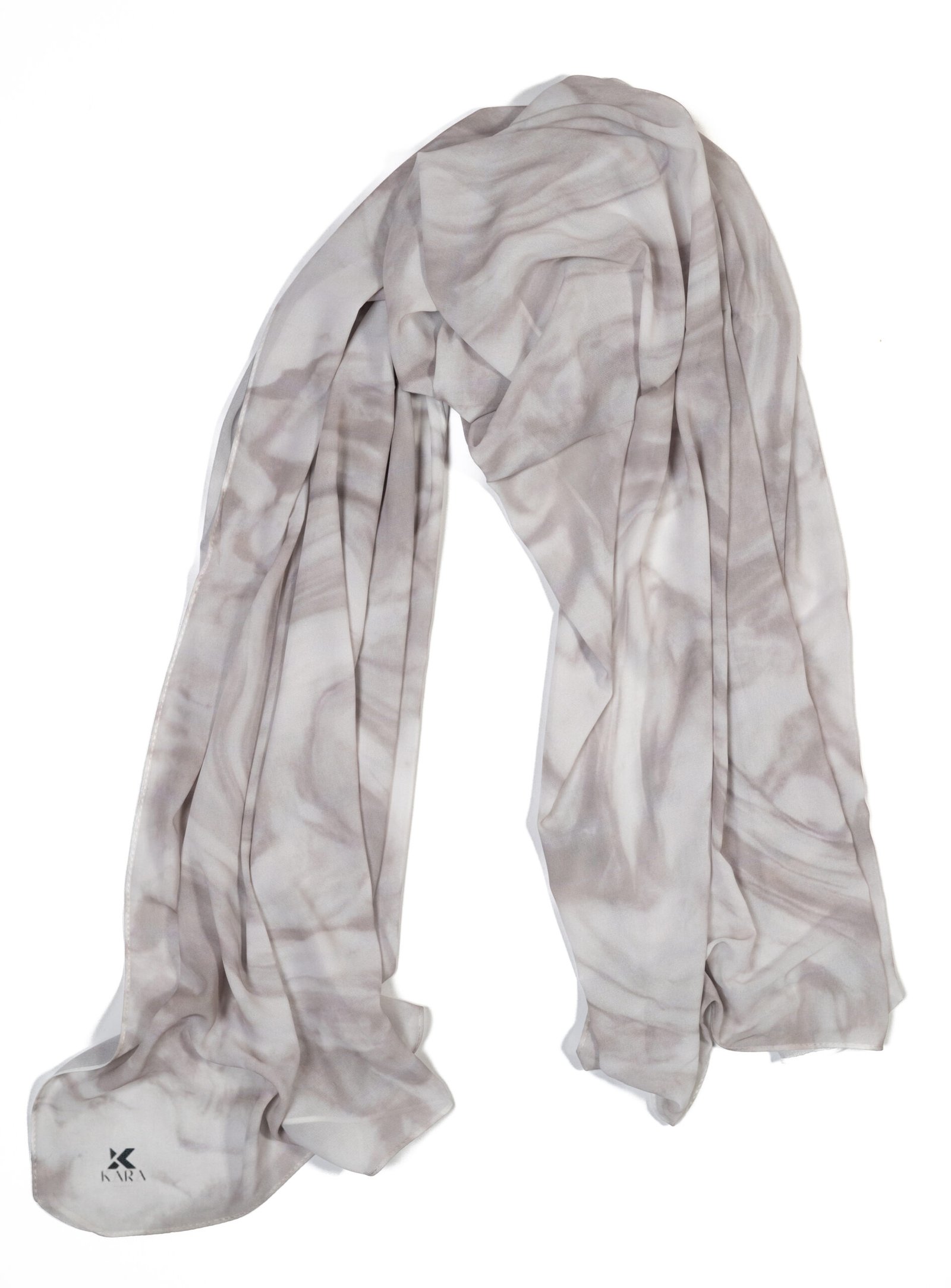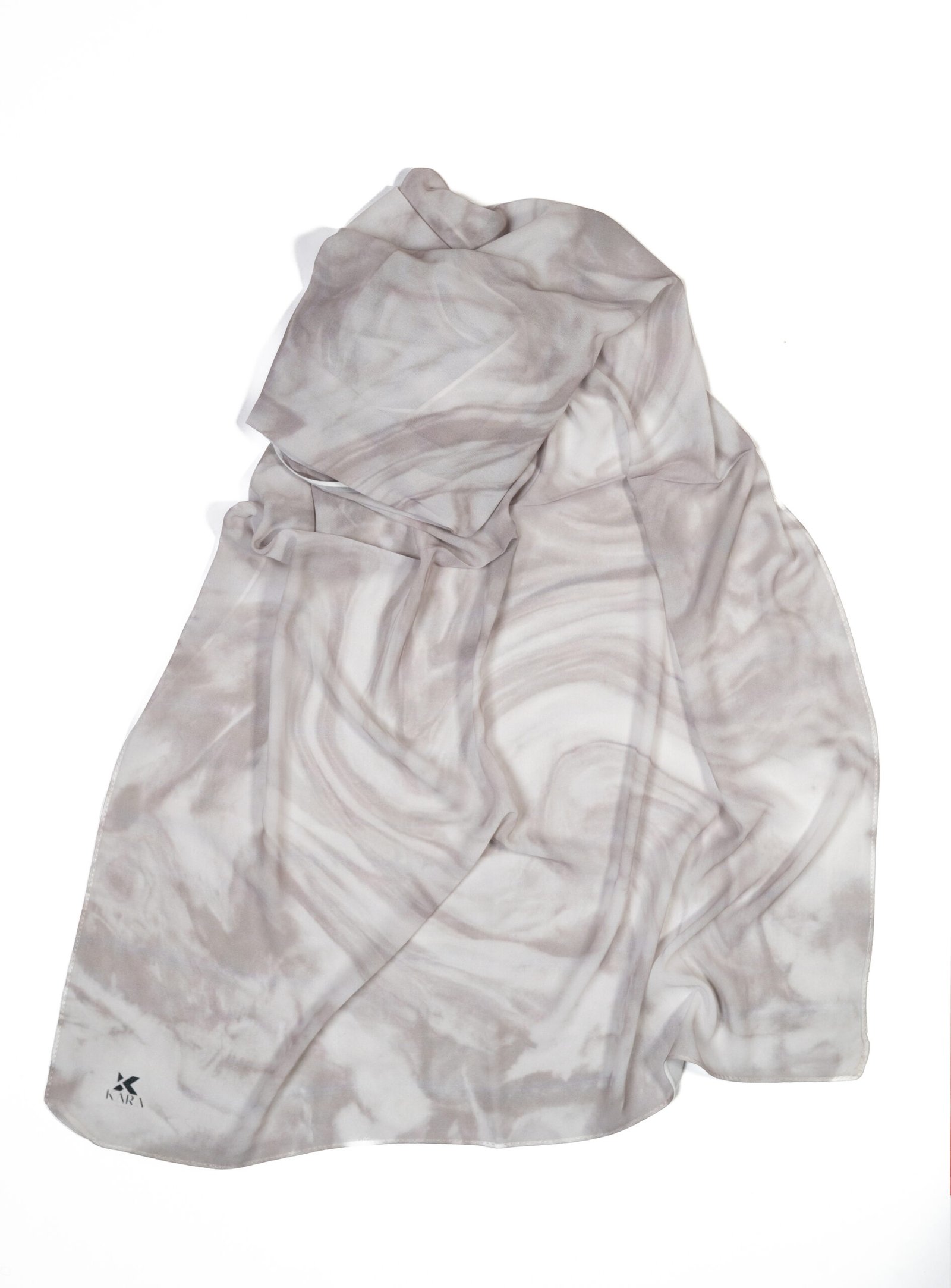 Serenity in Every Fold Capture the calm beauty of mountain mists and natural stone with the Himalaya Hijab. This exquisite piece features a fluid marble effect print in soft shades of dove grey, silver, and cloudy white. It is designed for the woman who appreciates subtle elegance and neutral tones that calm the senses.