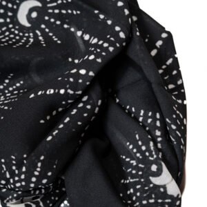 Celestial Motifs: Delicate white crescent moons, sunbursts, and starlight dots scatter across a canvas of deep, midnight black.