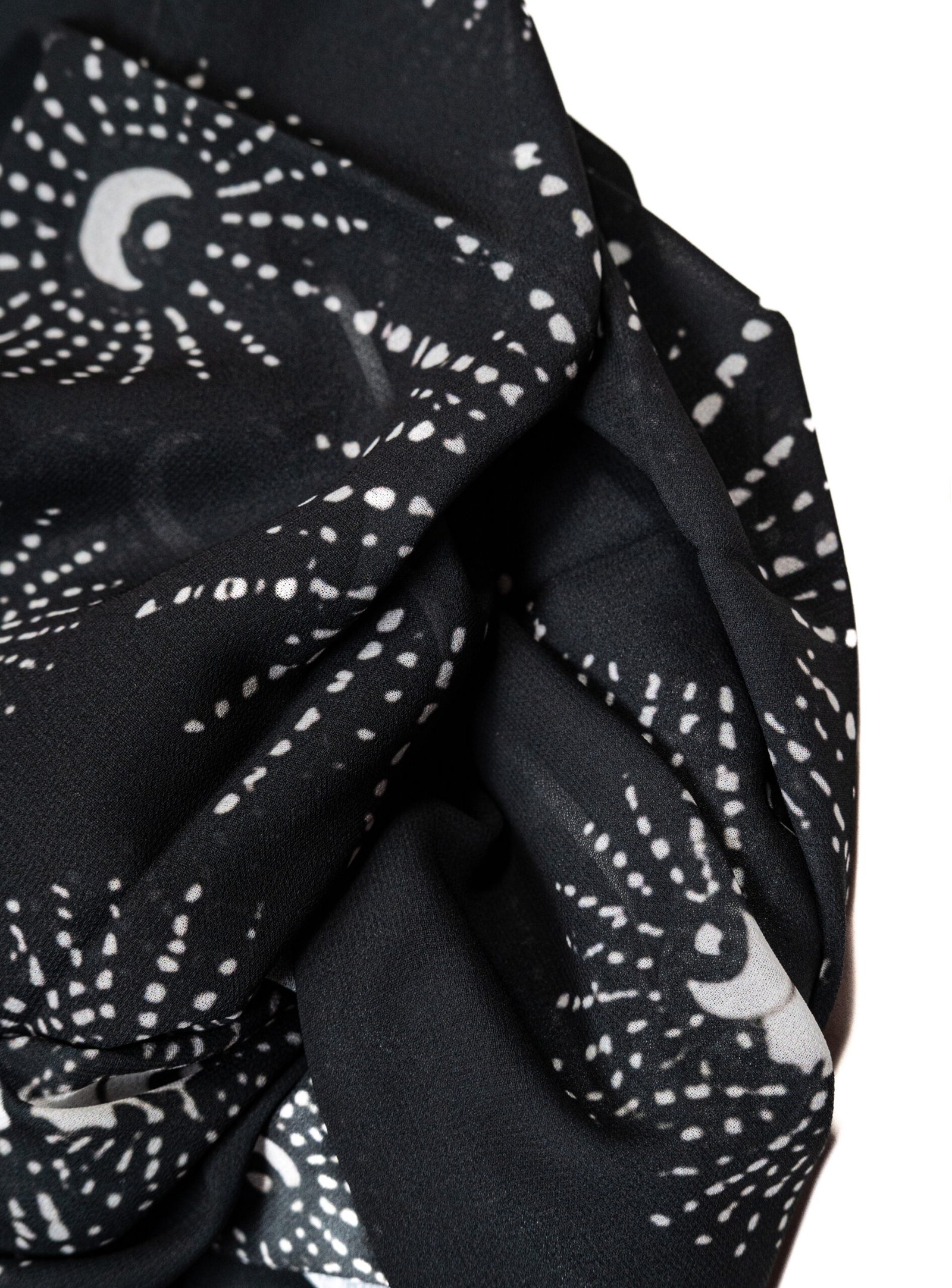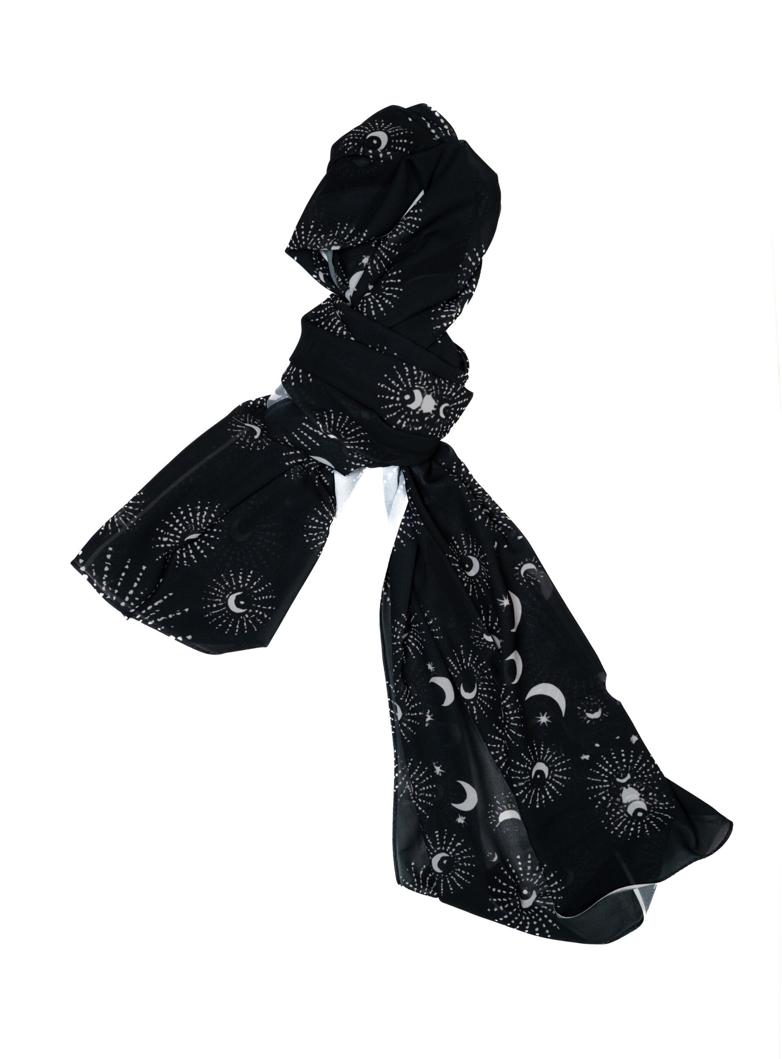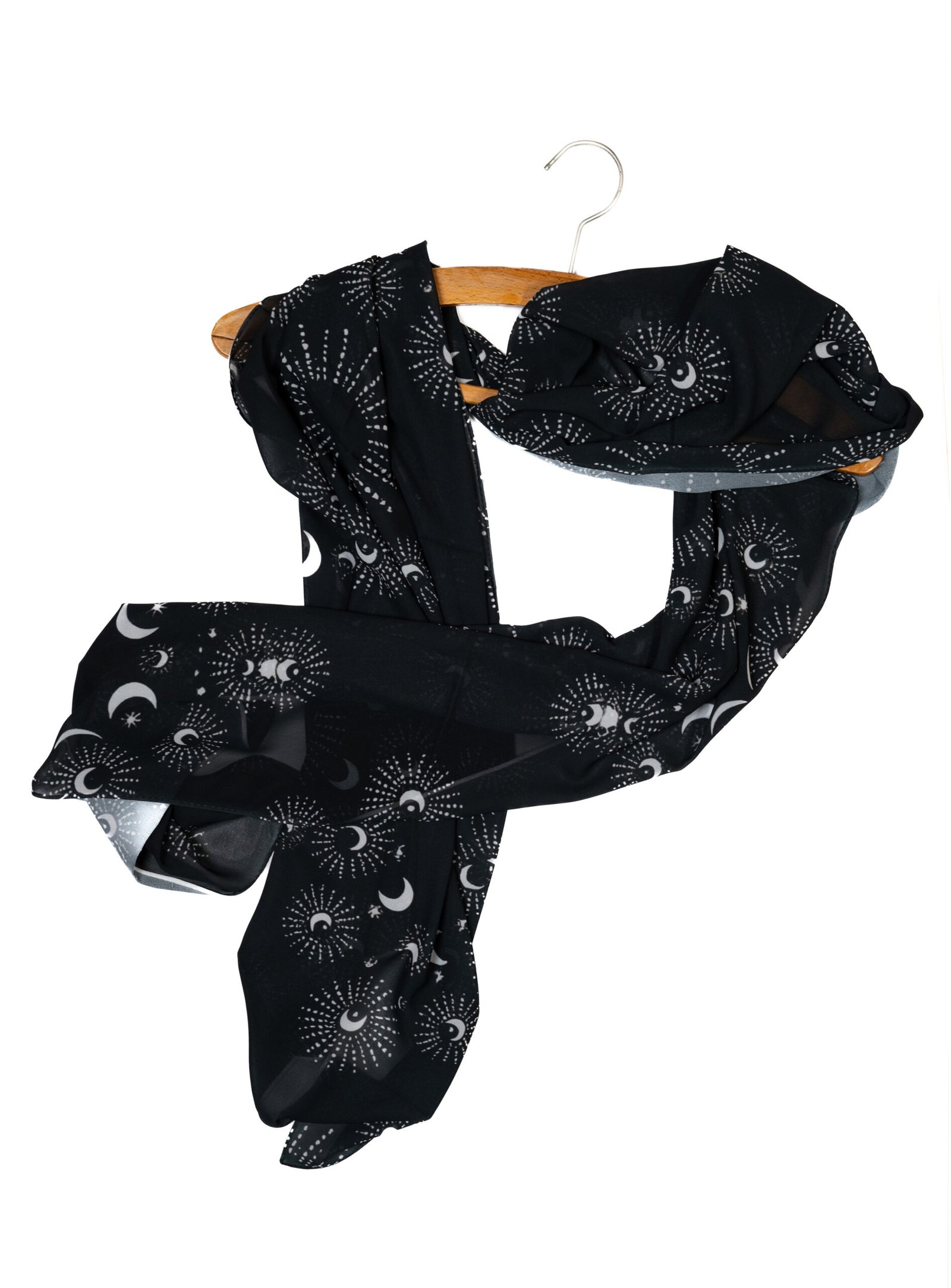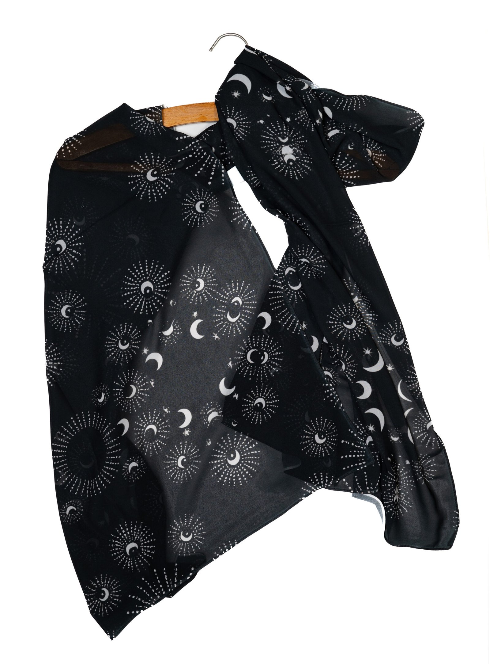 Flawless Drape: The chiffon flows beautifully, allowing the moon and star patterns to wrap dynamically around the face and shoulders.