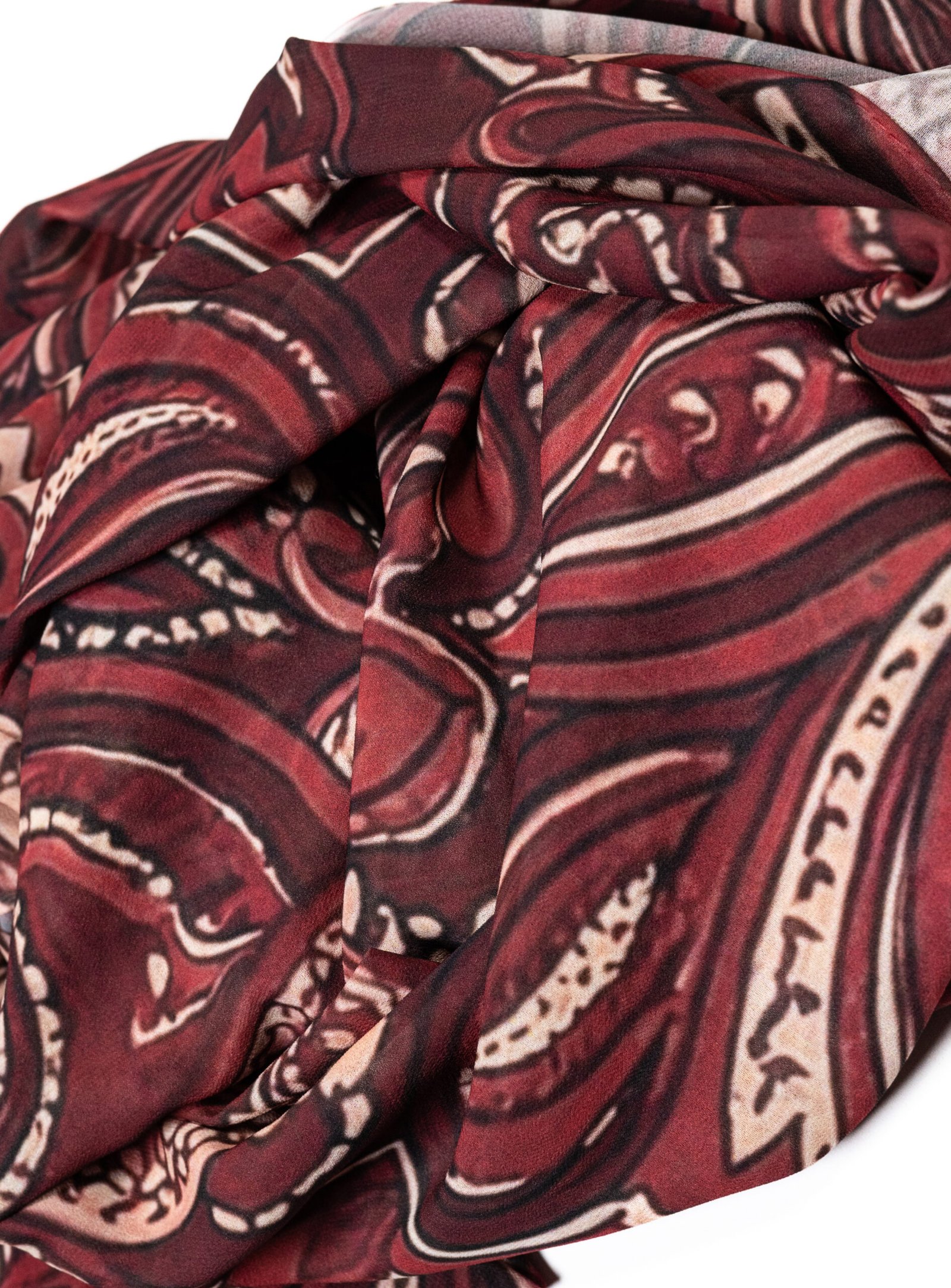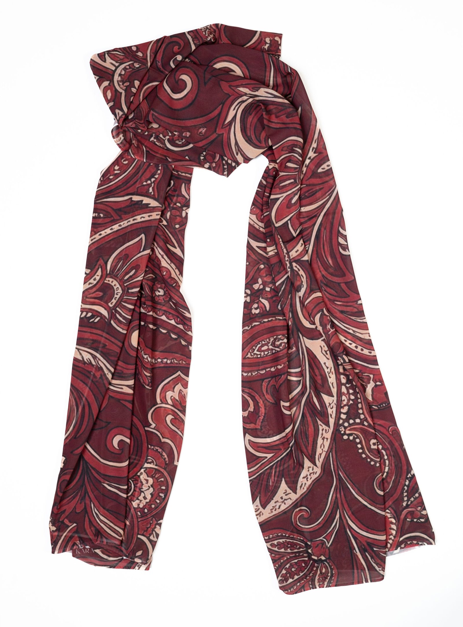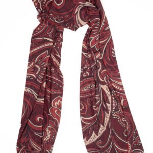 Timeless Motifs: The intricate paisley (boteh) and floral scrollwork give the hijab a bohemian yet highly sophisticated aesthetic.
