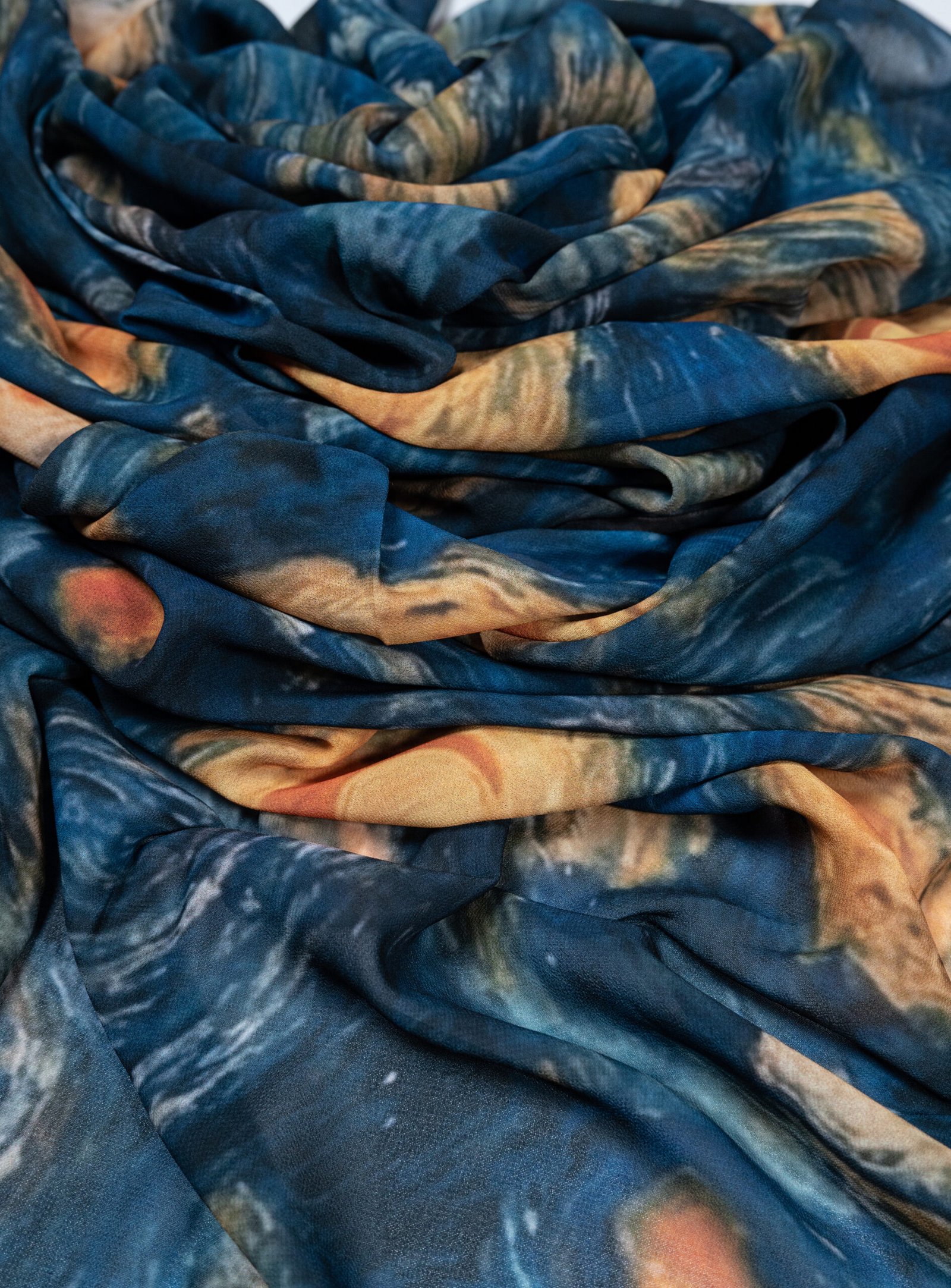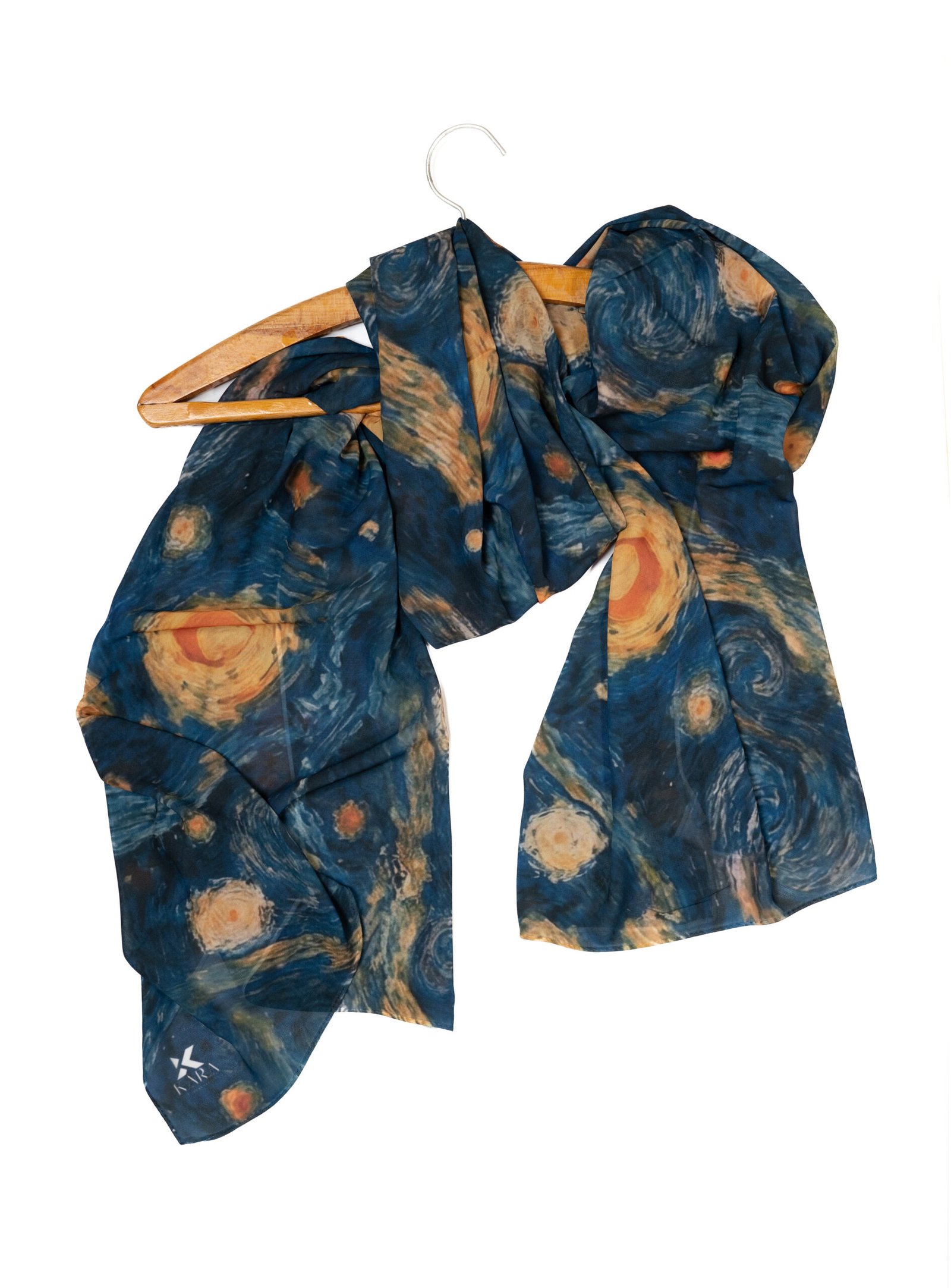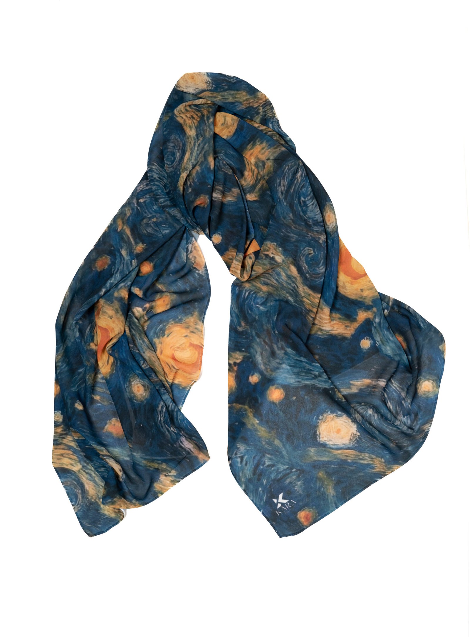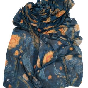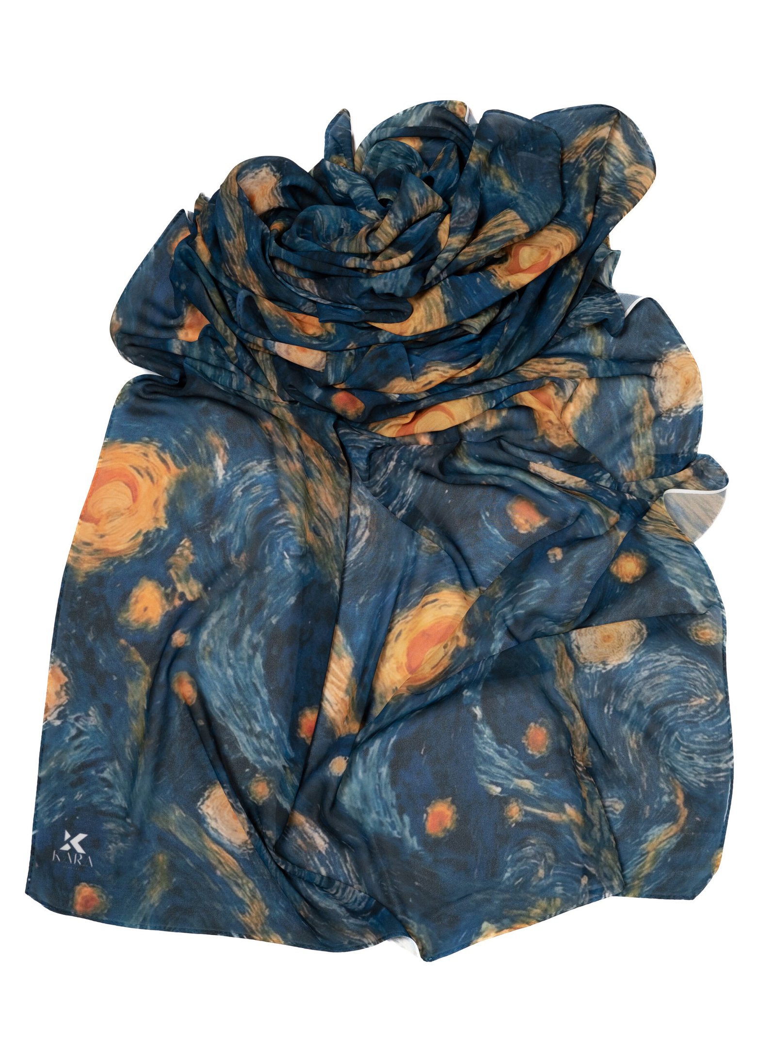 A Masterpiece You Can Wear Bring the gallery to your wardrobe with the Starry Nights Hijab. Deeply inspired by Vincent van Gogh’s most iconic painting, this design transcends traditional fashion to become true wearable art. It is the ultimate statement piece for the creative, bold woman who wants her style to spark a conversation.